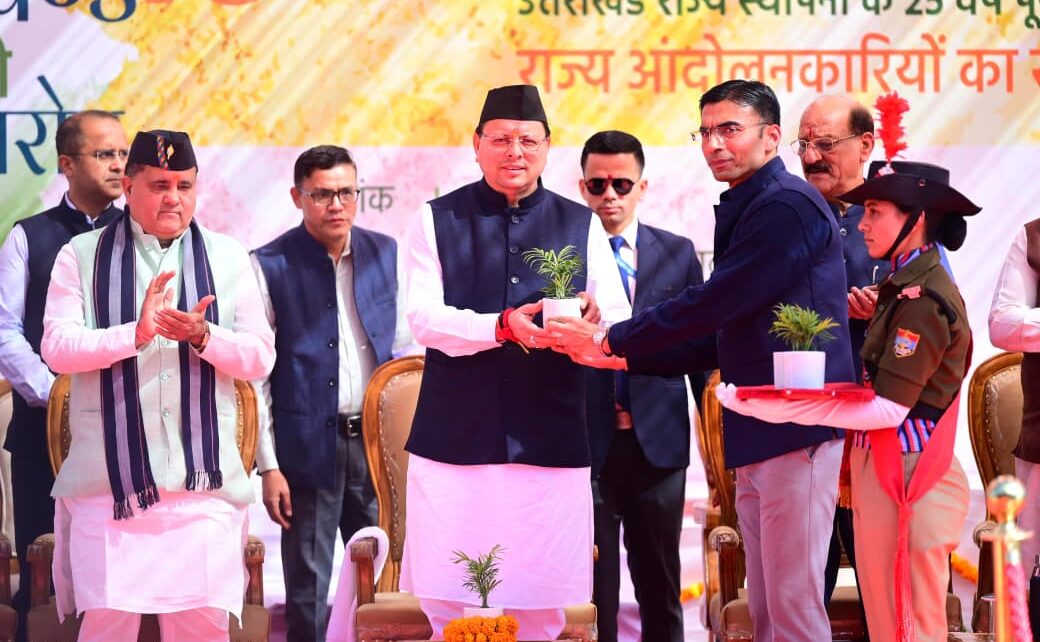 इसी क्रम में उत्तराखंड राज्य स्थापना के रजत जयंती वर्ष के अवसर पर मुख्यमंत्री ने पुलिस लाइन में आयोजित राज्य आंदोलनकारी सम्मान समारोह में राज्य आंदोलनकारियों और शहीद राज्य आंदोलनकारियों के परिवारजनों को सम्मानित किया। कचहरी परिसर शहीद स्थल और पुलिस लाइन देहरादून में इस अवसर पर राज्य आंदोलनकारियों पर हेलीकॉप्टर से पुष्प वर्षा भी की गई।